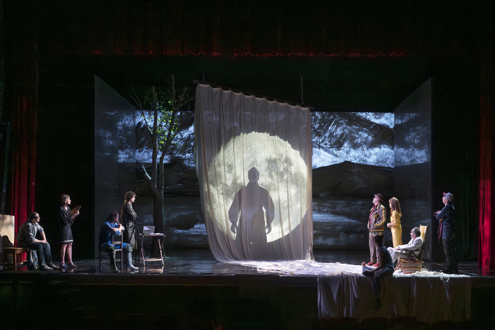 È questo il modo in cui incontriamo il maestro, innamorato di Maša, la figlia degli amministratori della tenuta di campagna in cui tutto avviene. Solo che lei non lo ricambia, perché il suo cuore batte per Kostantin, giovane aspirante drammaturgo a sua volta ingaggiato con Nina, che vuol fare l’attrice e a cui lui farà interpretare un monologo dai tratti “metafisici” (Kostja vuole rifondare il concetto di teatro e Dini fa fare la regia di questo metateatro al più giovane regista Leonardo Manzan). Tutto accade proprio sulle rive del lago, sotto una luna piena cocente: “Sono innamorati, e le loro anime oggi si fonderanno nell’ansia di creare un’unica immagine d’arte” dice il maestro alla ragazza.