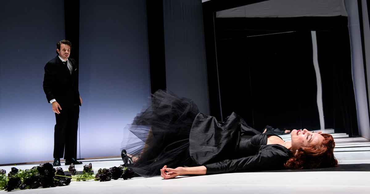 La regia di Davide Livermore (che firma anche le scene) procede ancora di più verso di noi, uomini e donne del presente, e ci sfida. I costumi sono anni Quaranta e predominano il colore viola e il nero (le due donne, Christine e Lavinia, hanno invece entrambe i capelli rosso fuoco, come il sangue e come il sesso); la tenuta è una successione di architravi e specchi dentro cui il mobilio è spezzato, scarno, riflesso, insufficiente, asimmetrico; i protagonisti danno molto spesso le spalle al pubblico, soprattutto mentre si affrontano, discutono o si amano e, a volte, l’uno è quasi nascosto dietro all’altro, come se ne fosse stato inglobato o annichilito. Le luci sono improvvise, fredde, taglienti e si scaldano quando dai pensieri si passa alle mani: schiaffi, uccisioni, dramma. La recitazione è a tratti volutamente enfatica e soprattutto Lavinia (nella bella interpretazione di Linda Gennari, ma è straordinaria anche Elisabetta Pozzi nei panni di Christine) resta impressa negli occhi dello spettatore: i movimenti imperiosi, la voce calda e un po’ maschile, la determinazione furente e ossessiva incarnano le nevrosi di una donna modernissima, ch’è fragile e decisa, risoluta ma confusa. Sacrificale, e per sua colpa. Allo stesso modo Orin (Davide Niccolini) veste un ideale maschile irrisolto, tirato per il bavero dalla madre, dalla sorella e dalla futura moglie che a detta di tanti (tante) oggi è l’inevitabile orizzonte di un maschile assediato dal femminile in resistenza.